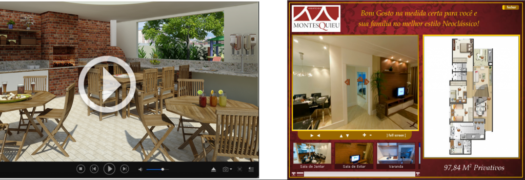 Uma excelente alternativa para complementar a apresentação do empreendimento é a utilização da computação gráfica para realização de um passeio virtual através de uma maquete eletrônica ou de uma, panorâmica 360º. Esta apresentação digital, pode ser disponibilizada no site do empreendimento. A principal vantagem da utilização destes recursos multimídia, é que o cliente em potencial, poder ter um primeiro contato com o empreendimento à distância. Já os cliente que efetivaram o negócio, acabam usando este recurso, para apresentar para seus amigos, fazendo o papel de formador de opinião.